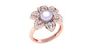 Elegantly crafted rose gold flower ring featuring a lustrous pearl centerpiece. The delicate floral design showcases expert metalwork with intricate petal details surrounding the pearl. Perfect for adding a touch of sophisticated femininity to any ensemble, this timeless piece balances classic and contemporary aesthetics.